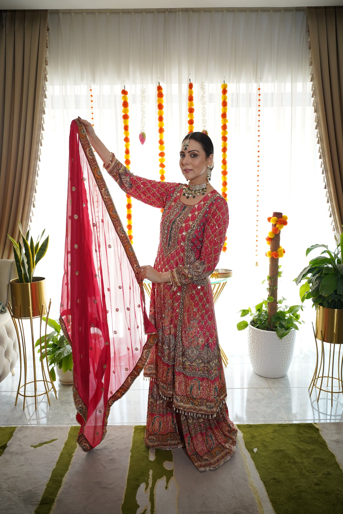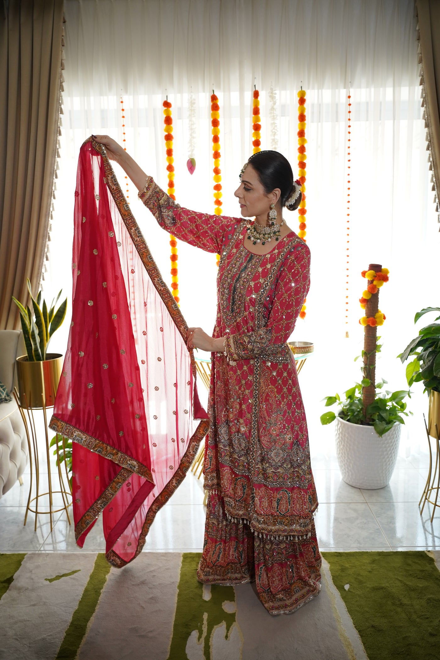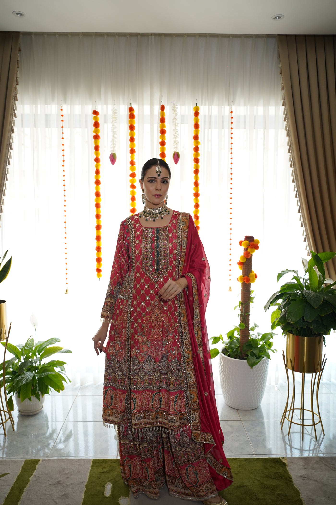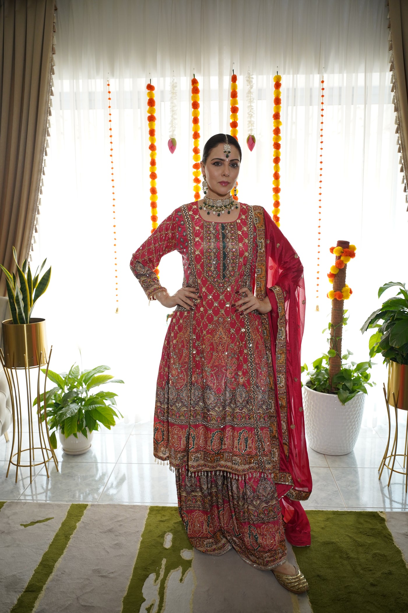 Exude timeless elegance in this pure crepe sharara set, richly adorned with heavy embroidery, sequins, beads, and intricate gota work. The detailed craftsmanship and luxurious finish make it a perfect choice for formal occasions, weddings, and grand celebrations. Paired with a matching dupatta, this ensemble delivers a regal and sophisticated look.