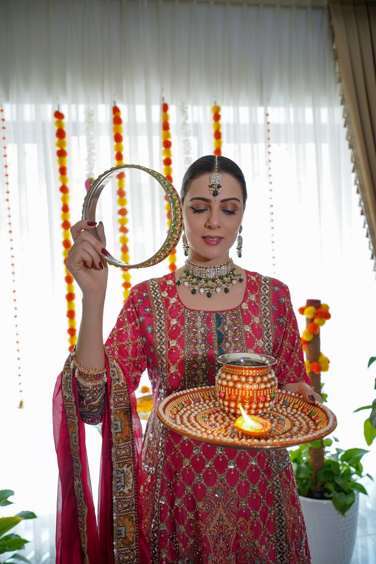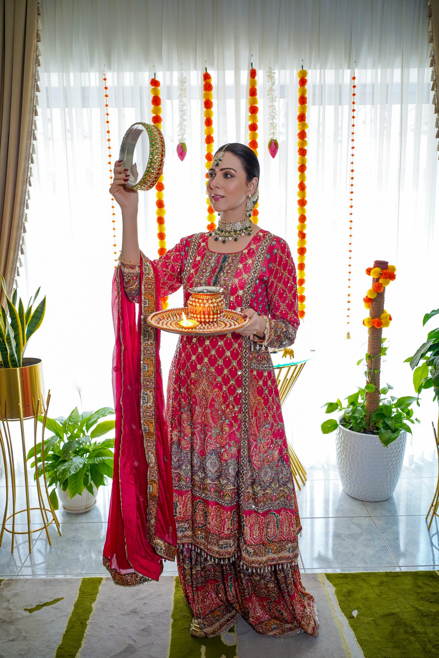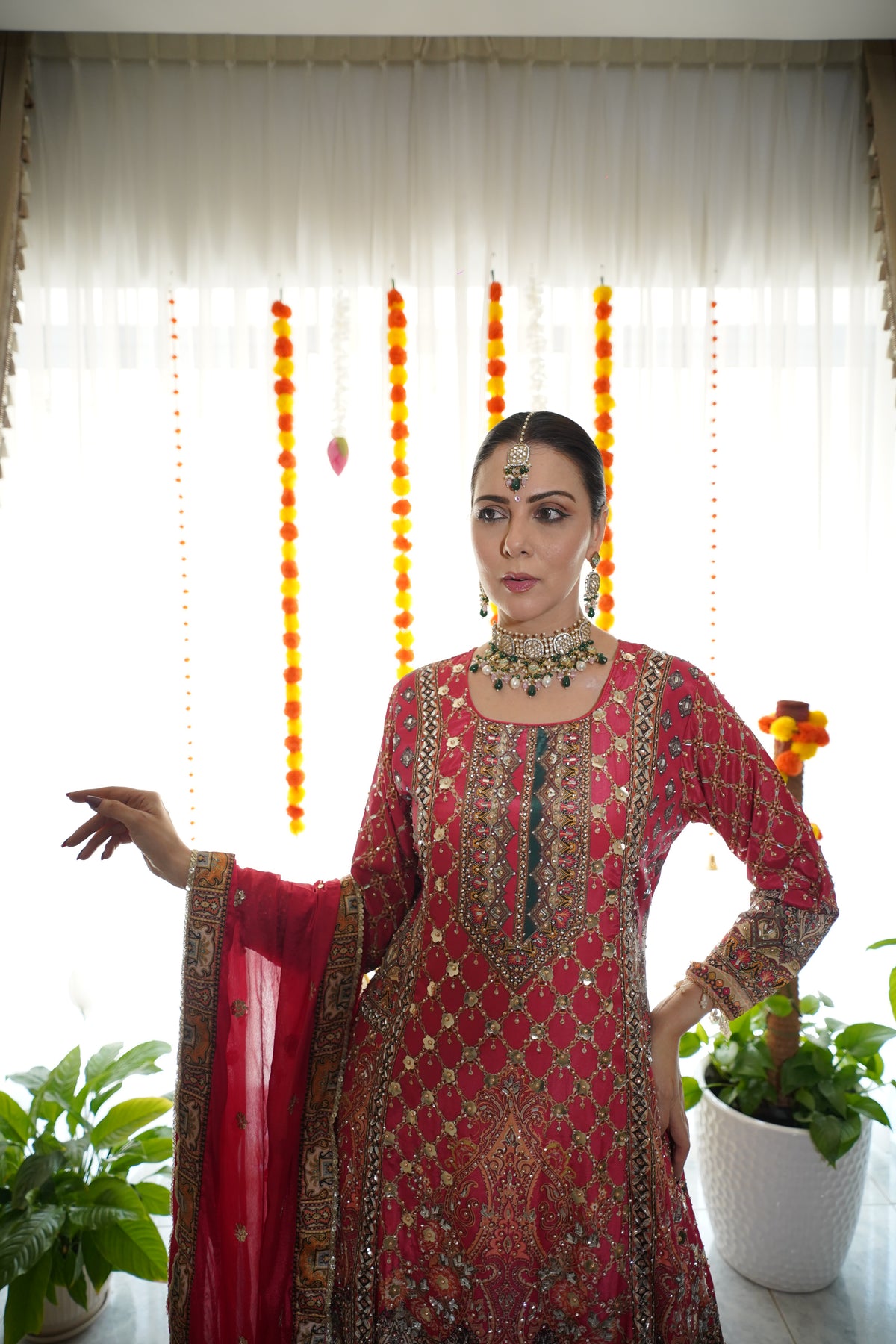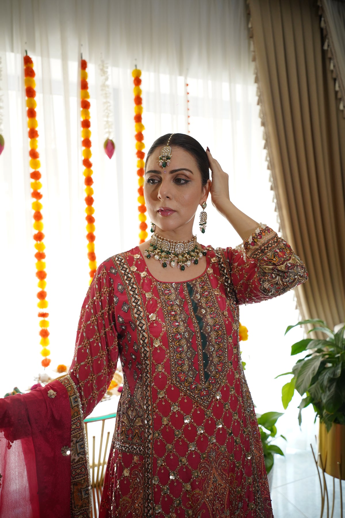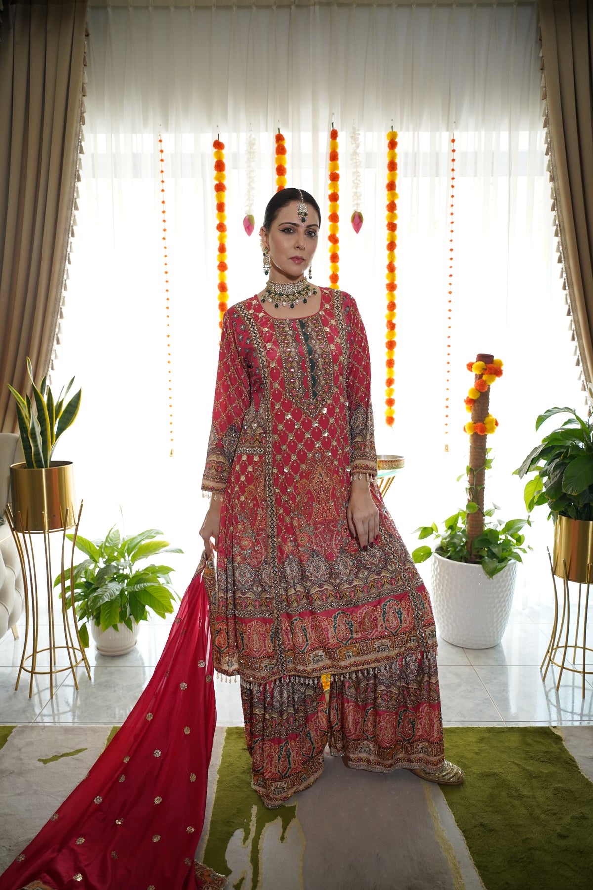 Exude timeless elegance in this pure crepe sharara set, richly adorned with heavy embroidery, sequins, beads, and intricate gota work. The detailed craftsmanship and luxurious finish make it a perfect choice for formal occasions, weddings, and grand celebrations. Paired with a matching dupatta, this ensemble delivers a regal and sophisticated look.